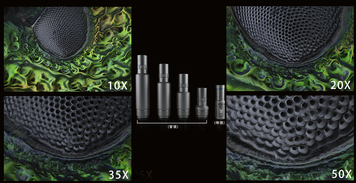 物镜为通用结构,通过切换管镜,可实现10X、20X、35X、50X的倍率切换。(管镜组合图)