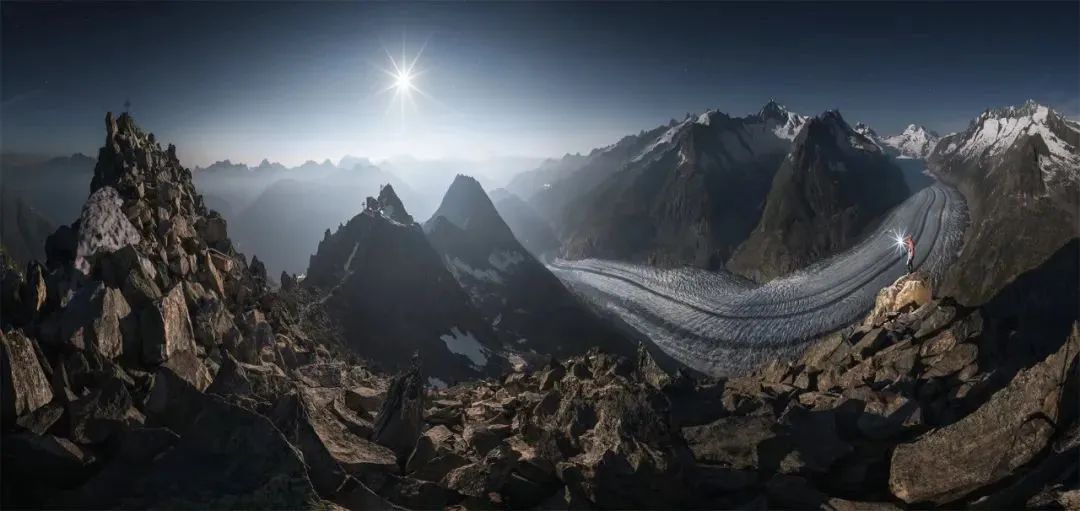 西藏然乌镇来古冰川,在2020年我就独自前往创作过,那时车子可以直接开到冰川脚下,没有游客更没有商业化,如今已然成为了景区。拍摄重心主要集中于在冻住的冰碛湖上寻找冰川融化后的裂缝冰洞。图中你可以看到前景下方半透明的冰块及顶部的纹理,而想要构图出彩则需要尽可能贴得足够近。